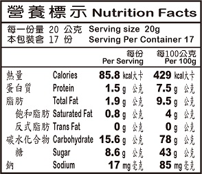 花生煎餅 (蛋奶素) 成 份:麵粉、糖、蛋、花生、牛奶粉、酥油[棕櫚油、乳化劑(脂肪酸山梨醇酐酯)、奶油香料、著色劑 (β-胡蘿蔔素、婀娜多)]、香料、鹽、膨脹劑(碳酸氫鈉) 淨 重:340公克±3% 有效日期:標示於包裝上 保存期限:300天 產 地:台灣 保存方法:避免放置於潮濕及日光曝曬處。 ※外袋拆封後請儘速食用完畢。 ※因為單袋包裝不易保存,易受潮,請另存放密封袋(罐)內,確保新鮮。 ※過敏原:本產品含有麩質之穀物、蛋、花生、牛奶及其製品。 ※注意※ 本產品屬於易碎品,商品再寄出前,皆經過檢查為正常無破損狀態,才予以寄出,運送過程中無法避免碰撞,餅乾類商品有機率會有破掉或產生餅乾屑等情況問題,請各位消費者可接受者在下單,商品售出即不可隨意退換貨,有任何相關問題,歡迎詢問。