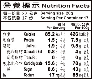 芝麻煎餅 (蛋奶素) 成 份:麵粉、糖、蛋、芝麻、牛奶粉、酥油[棕櫚油、乳化劑(脂肪酸山梨醇酐酯)、奶油香料、著色劑 (β-胡蘿蔔素、婀娜多)]、香料、鹽、膨脹劑(碳酸氫鈉) 淨 重:340公克±3% 有效日期:標示於包裝上 保存期限:300天 產 地:台灣 保存方法:避免放置於潮濕及日光曝曬處。 ※外袋拆封後請儘速食用完畢。 ※因為單袋包裝不易保存,易受潮,請另存放密封袋(罐)內,確保新鮮。 ※過敏原:本產品含有麩質之穀物、蛋、芝麻、牛奶及其製品。 ※注意※ 本產品屬於易碎品,商品再寄出前,皆經過檢查為正常無破損狀態,才予以寄出,運送過程中無法避免碰撞,餅乾類商品有機率會有破掉或產生餅乾屑等情況問題,請各位消費者可接受者在下單,商品售出即不可隨意退換貨,有任何相關問題,歡迎詢問。